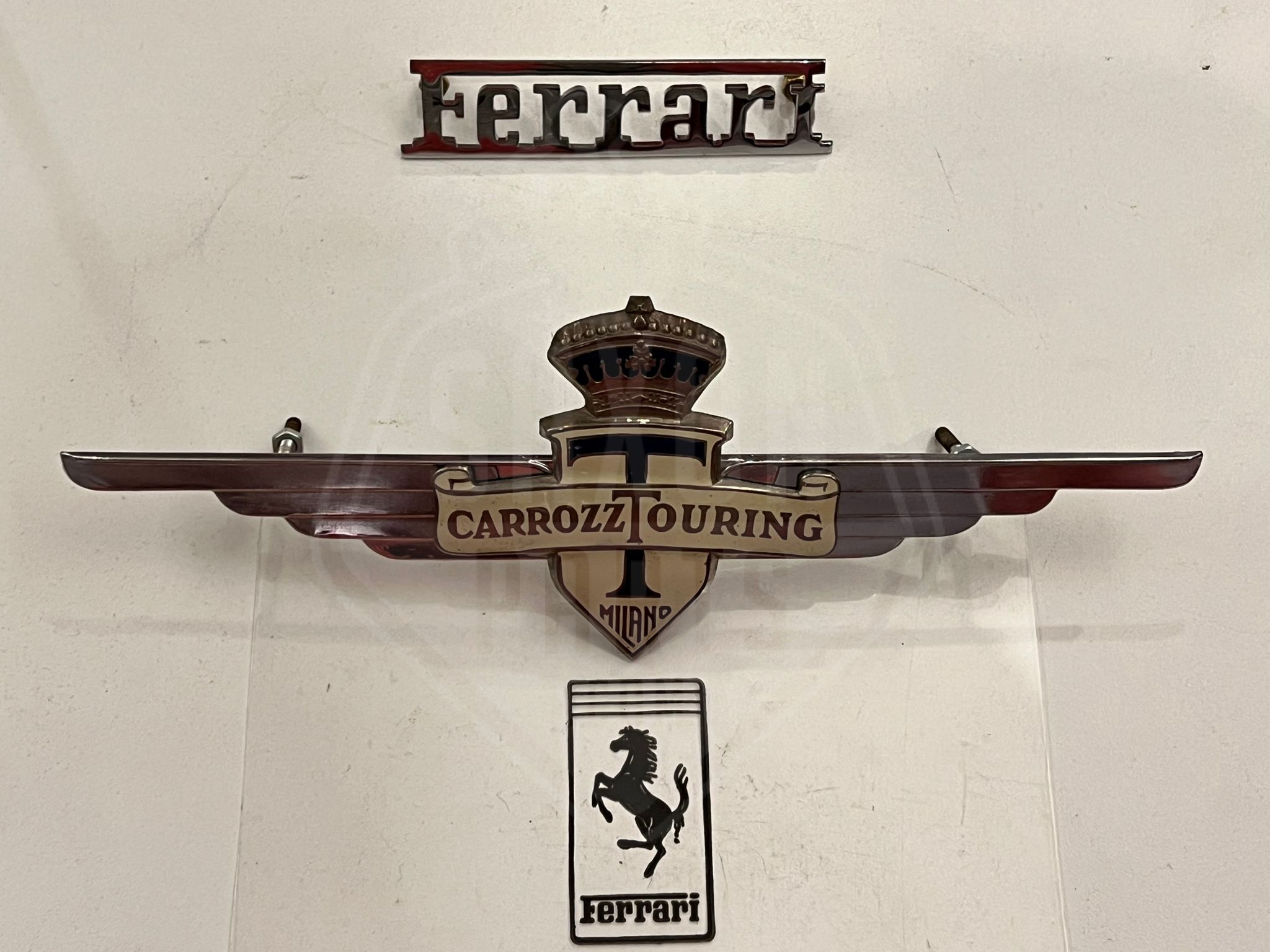 This is a new old stock rear bonnet badge Carozz Touring (Carrozzeria Touring) and is 200mm.